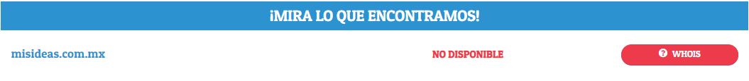 Su uso es intuitivo y sencillo. En la barra de búsqueda puedes colocar tu nombre de Dominio elegido, aquí utilizaremos “misideas.com.mx” para ejemplificar, luego pulsamos en Buscar: