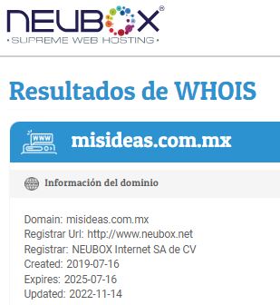 Y podremos ver que no se encuentra disponible. Al lado del estatus, notaremos un botón que dice “WHOIS”. WHOIS (quién es), es un protocolo de transmisión que sirve para realizar consultas en una base de datos, en la cual podemos averiguar el propietario del nombre de dominio que buscamos. Al pulsar el botón, podremos leer la información de dicho propietario, que en éste caso, es NEUBOX: