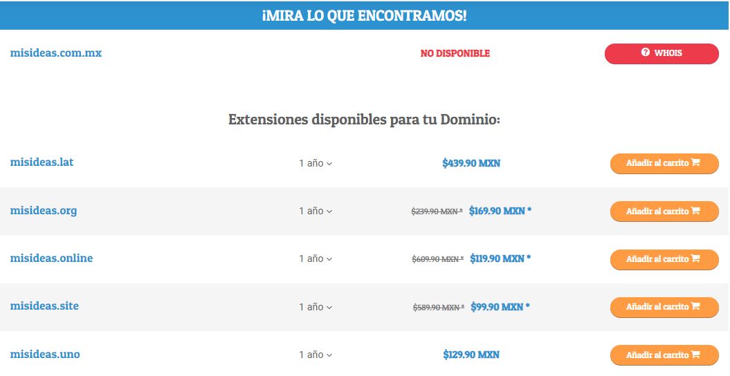 ¡Pero no desesperes! Aunque ese nombre de Dominio no se encuentre disponible, nuestro buscador te sugerirá algunas alternativas con otras extensiones, así como sus costos de contratación por 1 año, o más si así lo deseas: