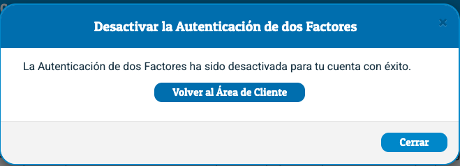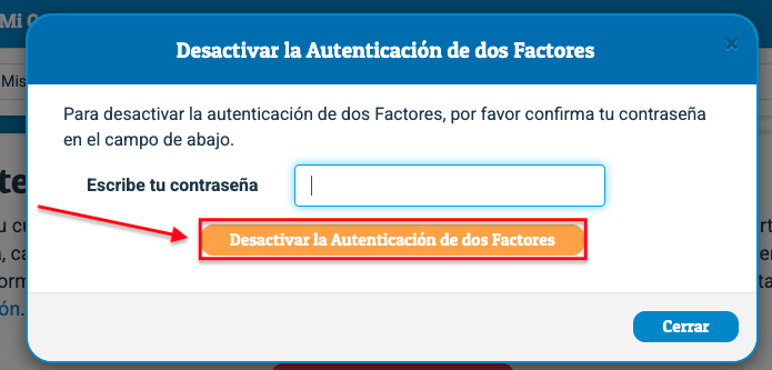 Ingresa tu contraseña con la que ingresas a tu Panel de Clientes y da clic en “Desactivar la autenticación de dos Factores”