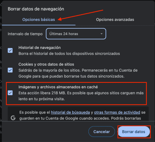 - En la pestaña Básico, selecciona Imágenes y archivos en caché.