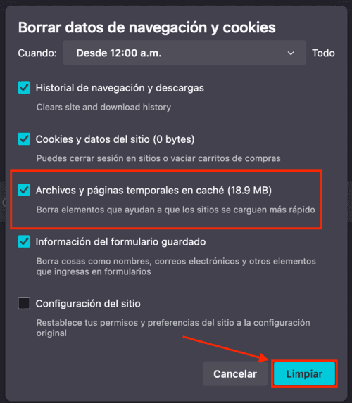 - En Cookies y datos del sitio, haz clic en Borrar datos… y selecciona lo que deseas eliminar.