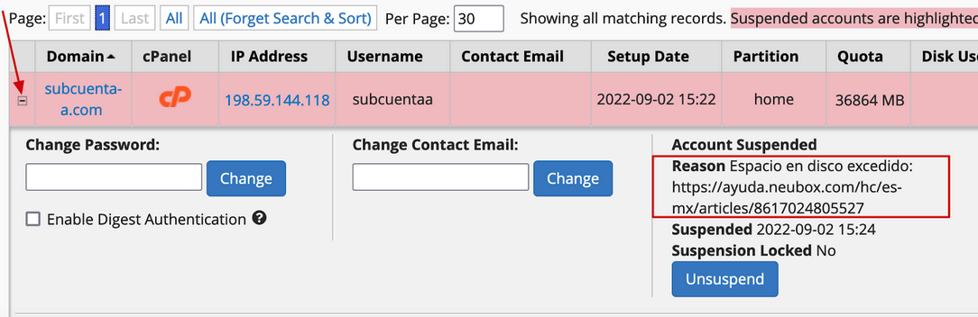 Si contamos con una cuenta suspendida dentro de nuestro Reseller con el mensaje Espacio en disco excedido, significa que la subcuenta ha superado la cuota en disco asignada en el paquete.