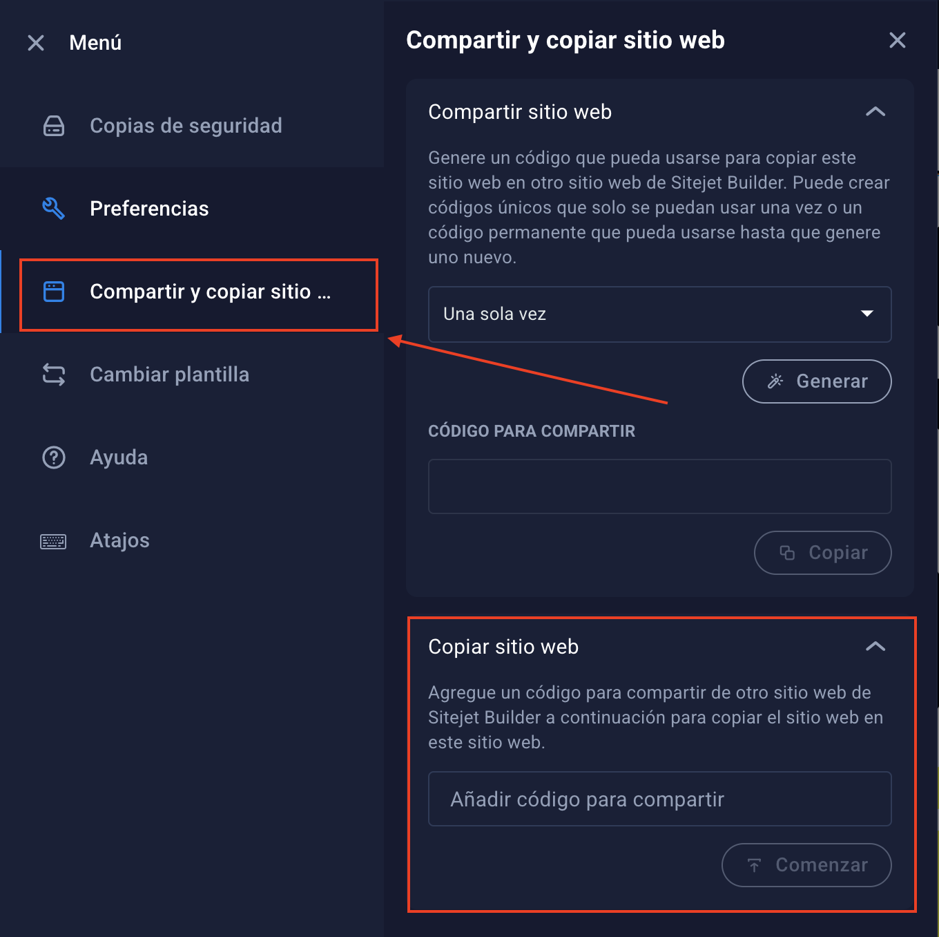 - Dentro del menú, ve a Compartir y copiar sitio.