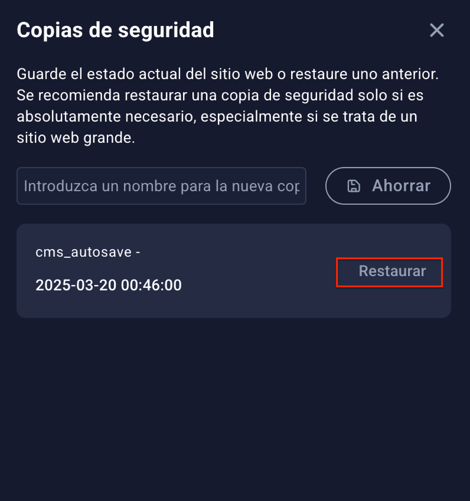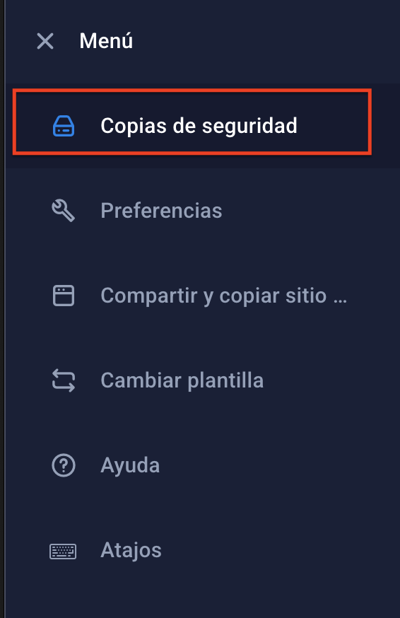 Gestor de Copias de Seguridad en Sitejet Builder