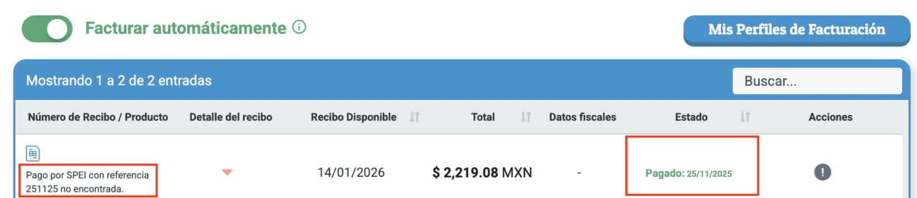 El recibo original marcado como PAGADO con la descripción “Pago por SPEI no encontrada”.